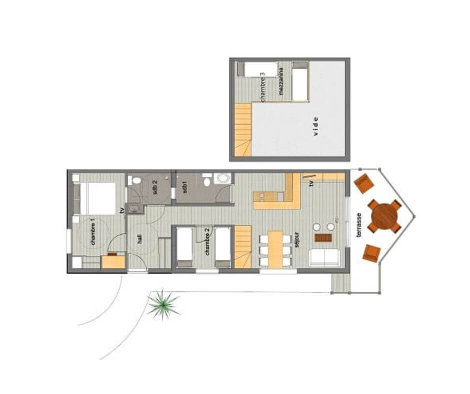 - Un espace en mezzanine avec deux lits individuels, dont un lit superposé (le couchage en hauteur ne convient pas aux enfants de moins de 6 ans. Charge maximum 70 kg).